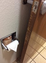Just kidding. I can’t rhyme for crap. This happened….the shower was an excellent massage—for my lower back. I can never decide whether to bend over frontwards and grab my ankles in order to rinse my hair or limbo under a progressively lower shower curtain rod. Do you see anything funny about the toiletry shelves in here? I am a girl who loves a toiletry. I could start a store in this shower. I didn’t take a picture of the floor because I am pretty sure you can catch hepatitis from looking at a picture of it. The door frame looked like the basement door from It and the door from that movie The Knowing had a dirty door love child. The bath towels were about the size of a paper towel. And not nearly as cuddly. I laughed trying to figure out whether to cover my boobs or my butt. “Um, can I borrow a towel, my car just hit a water buffalo.” Last, and certainly not least… Who makes a TP pointy when there are seven sheets of TP left? Um, the jig is up. There is no way to fold TP without TOUCHING it! Those squares have been rendered useless. And the rest of the roll is suspect. Pointy TP is weird.