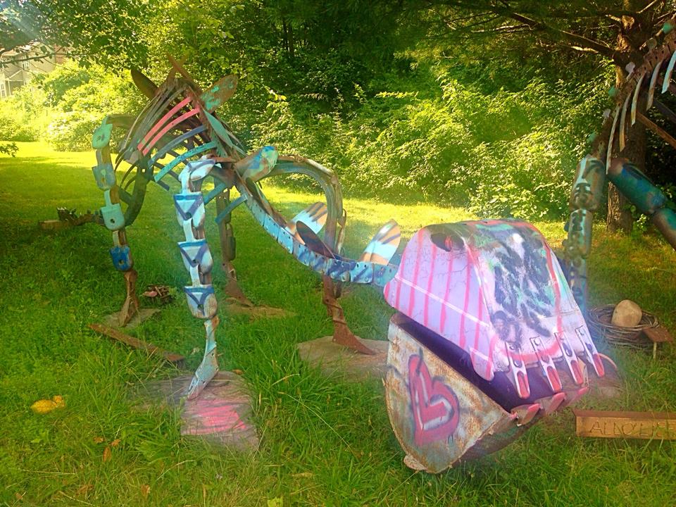 My journey to find the ever elusive Post Office was waylaid by a roadside tinkerer who makes dinosaurs out of scrap metal, a brick arched bridge, a cavalcade of Melody Minx’s favorite flowers in different colors than I have ever seen out West, and a bakery called, “Get Baked” where the baked goods were delicious, if oddly cannabis free.