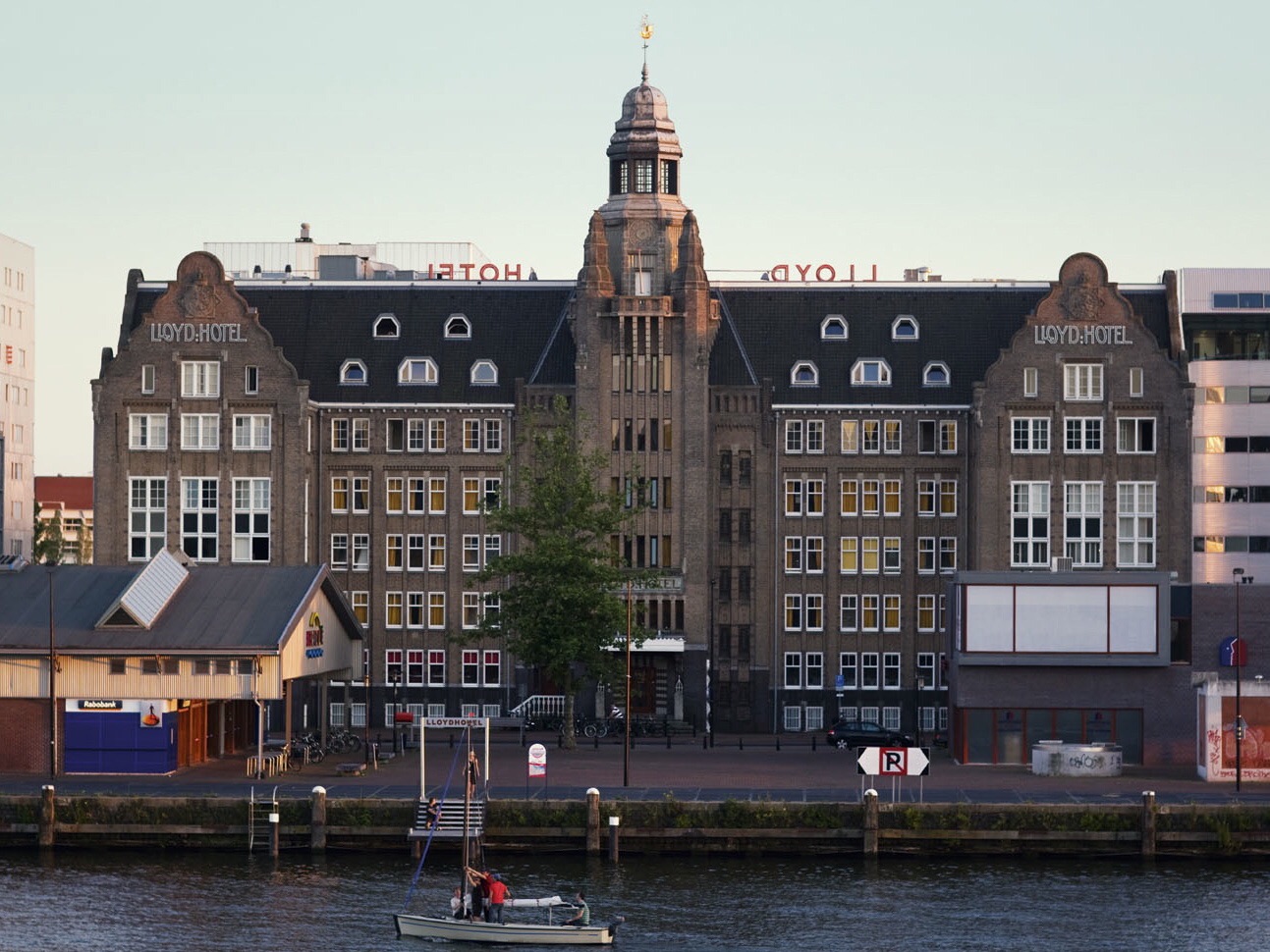Wow. I’m in Amsterdam. After a long day of driving, we were a little punchy by the time that we arrived at the hotel last night. After some pretty deep searching, we chose to stay at the Lloyd Hotel which is a mixed star residence outside of the canal rings of the city. It started it’s life as a glamorous hotel where Dutch and European emigrants could stay while their health check up and background check cleared before leaving the country. Later, it served as a prison for Nazi sympathizers during the times when Amsterdam was trying to keep the Reich at bay, then turned into a reform school for wayward boys before being remodeled into an art space hotel. There are rooms that range from one star (in the basement, share bathrooms) to 5 star (top floor, views, luxurious fixtures and settings and, in my case, a swing in the middle of the room) and the guests all intermingle–the schmaltzy and the schmutzy alike.