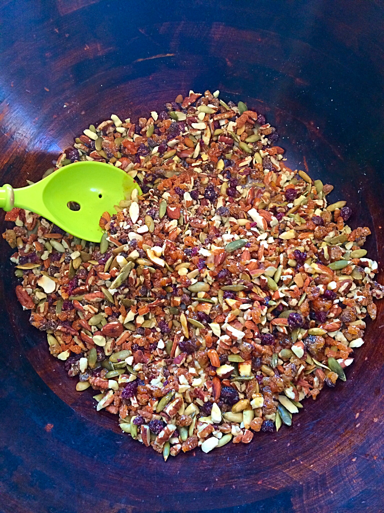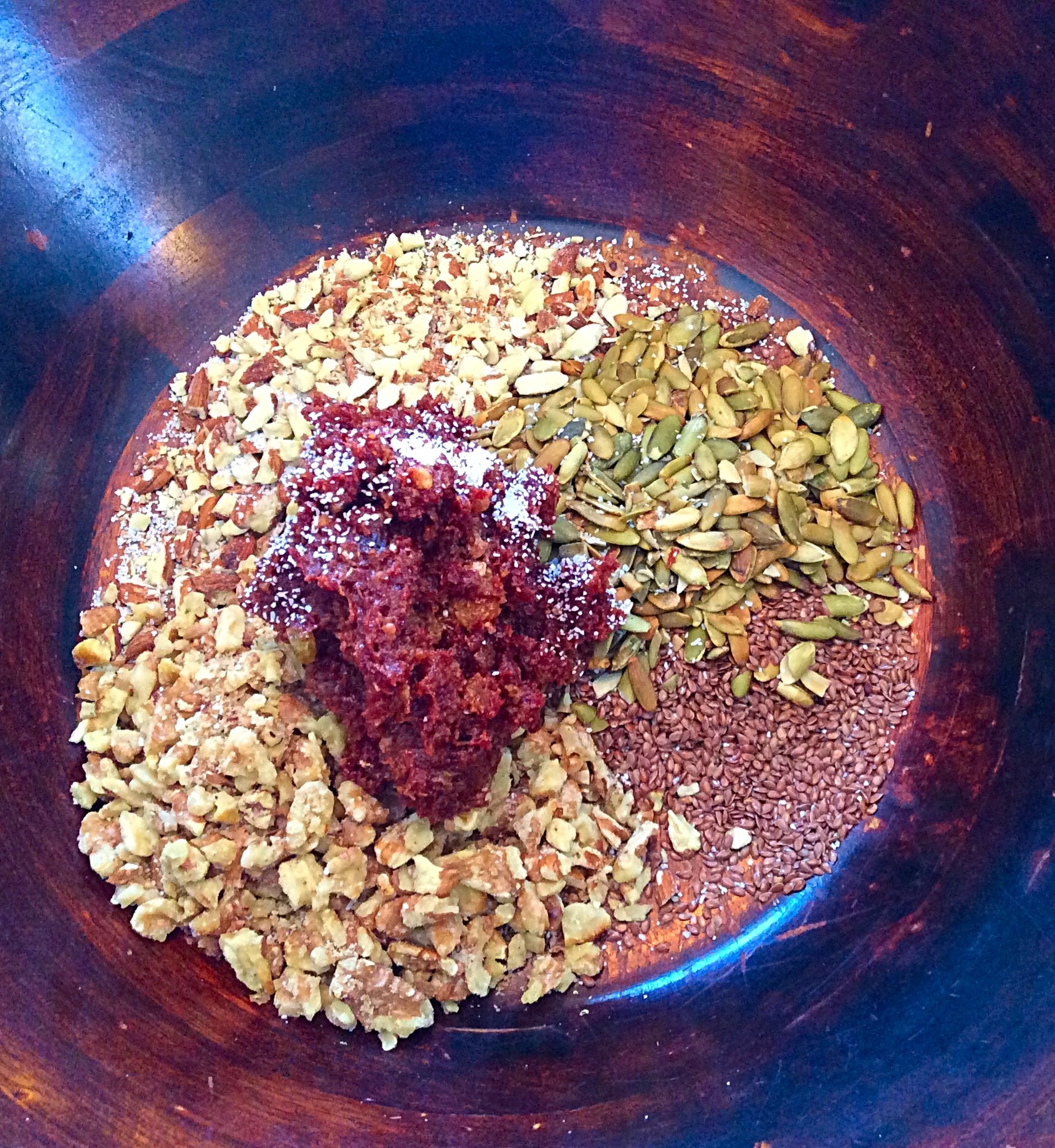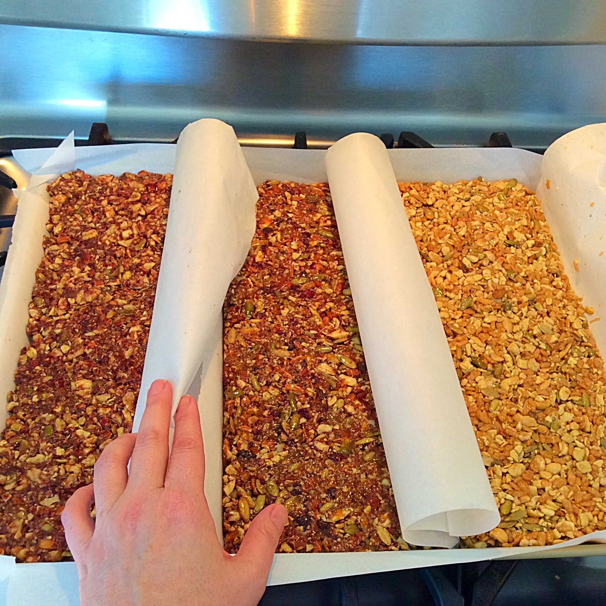 Really. That’s it. The fun and deliciousness happens when you make them your own. Today, I made three different versions of bars (I like to make ahead and they actually keep well for at least a month if you store them carefully). This ratio of ingredients makes 12 bars maybe a smidge bigger than the store bought ones. Note- I’m not a food blogger and I am NOT a photographer. All photos are taken with my slightly greasy iphone.