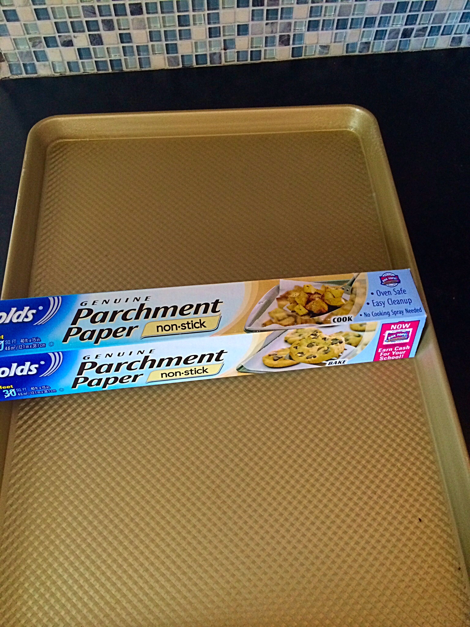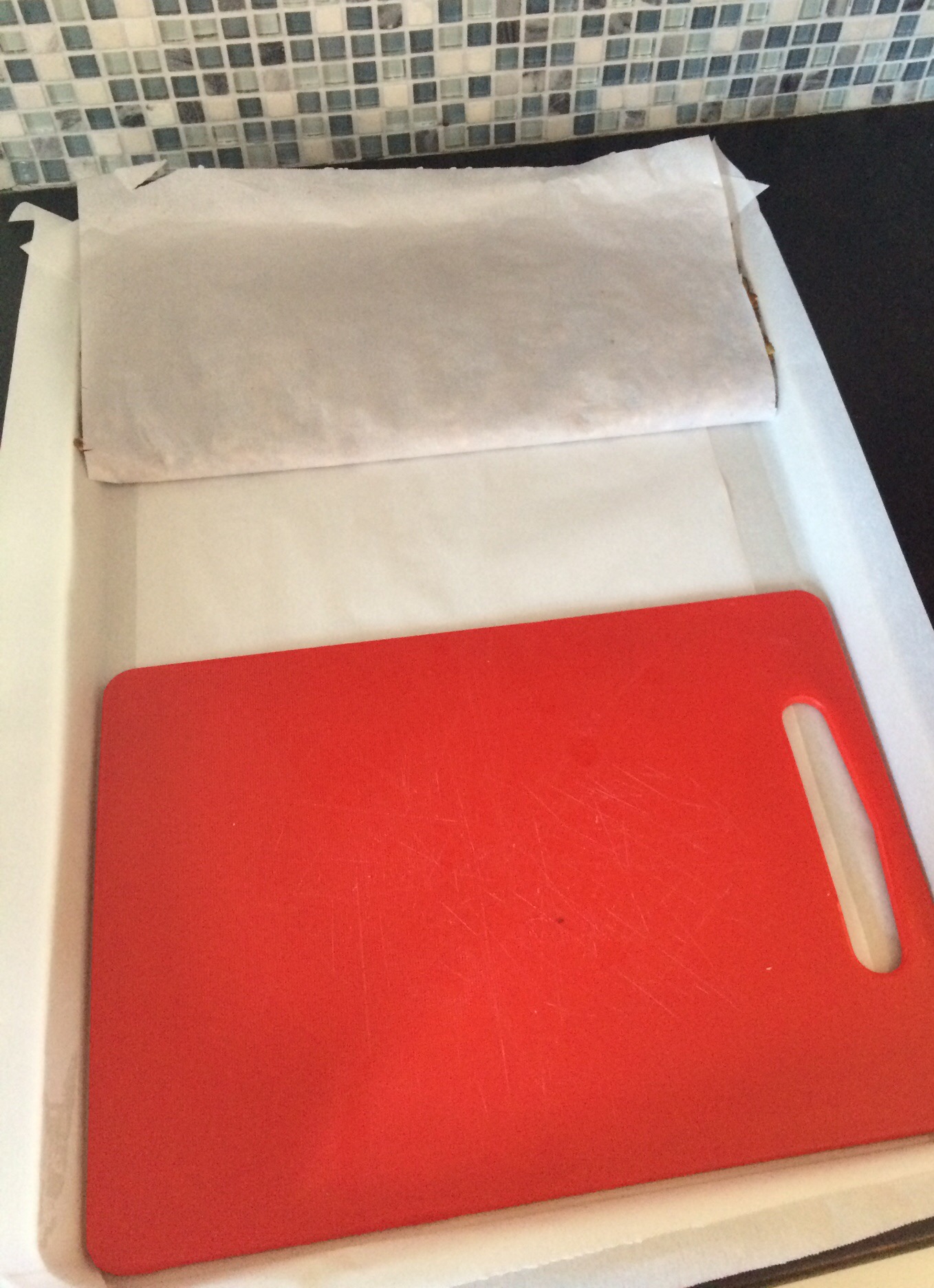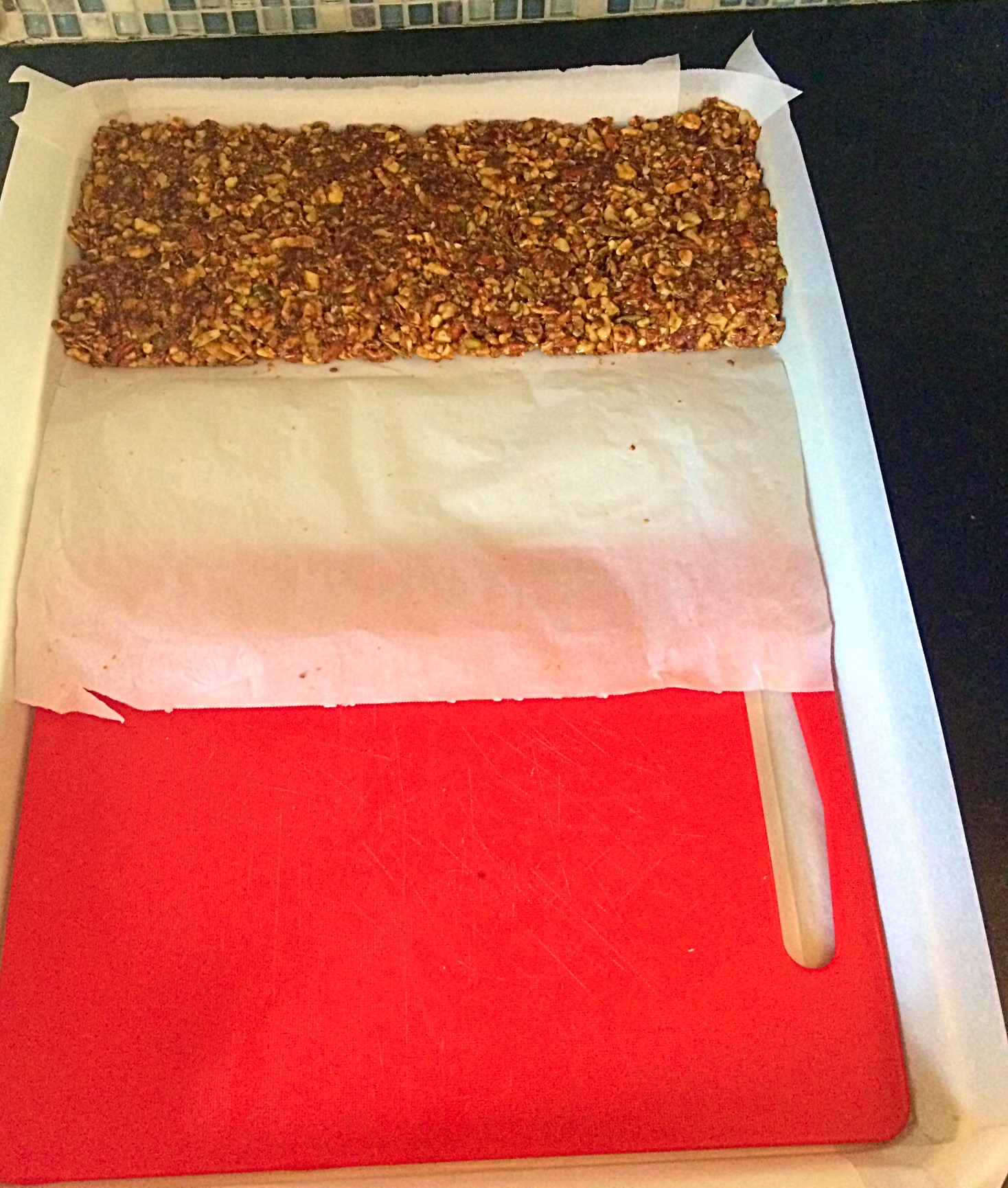 Spread on parchment lined baking sheet. If you are making just one batch of bars, you could use a small square pan or even a pie pan. I always thought that they would be interesting cut into little wedges. Parchment is very important. Do not think that cooking spray or aluminum foil will sub. This stuff is the stickiest shit on earth. No joke. This is coming from a girl who makes her own homemade marshmallows. USE PARCHMENT. I use an extra large cookie sheet because it is exactly 12 bars across. This monster is 14.5 inches by 20.5 inches.