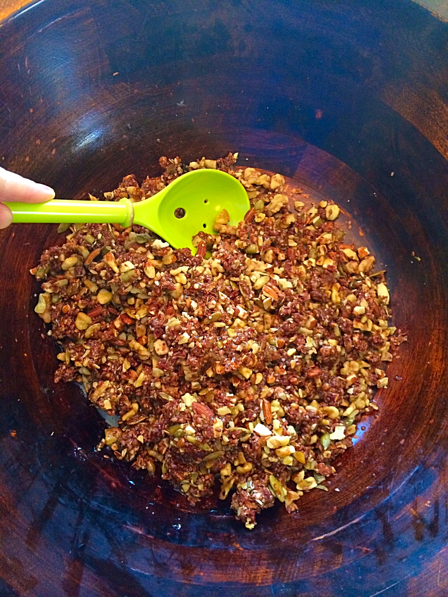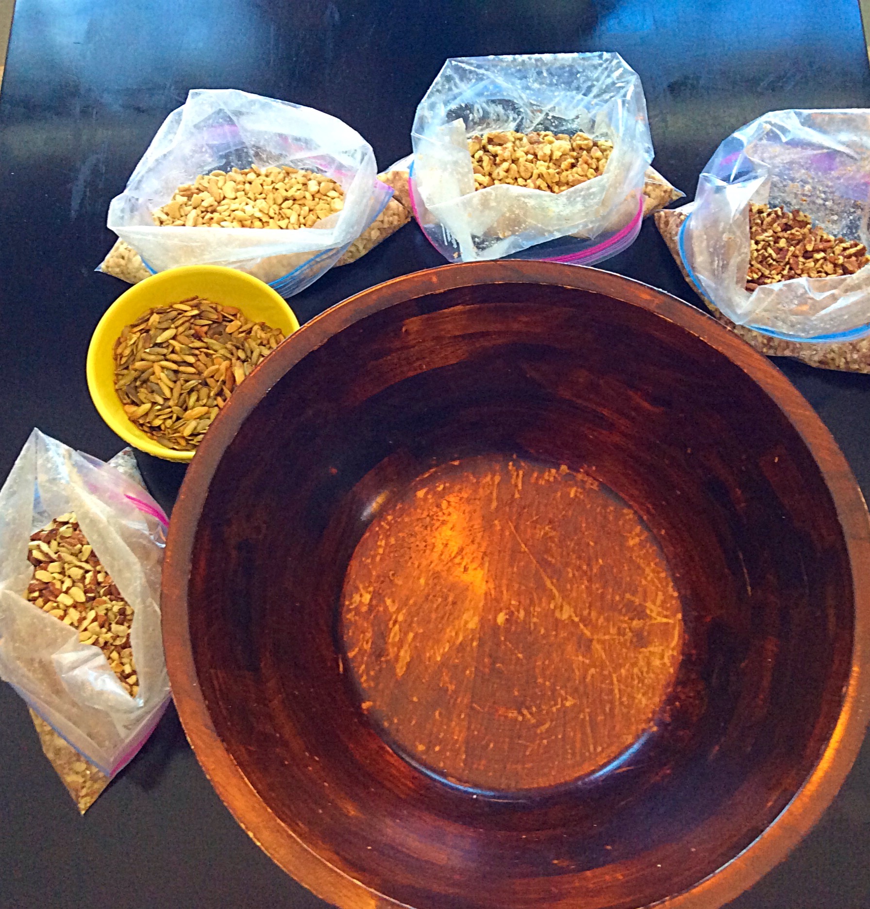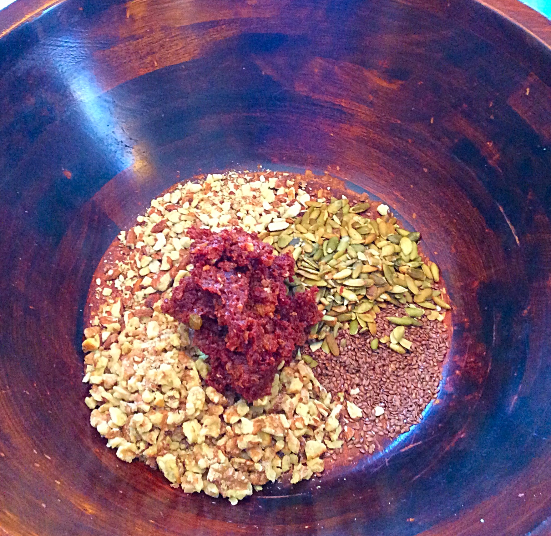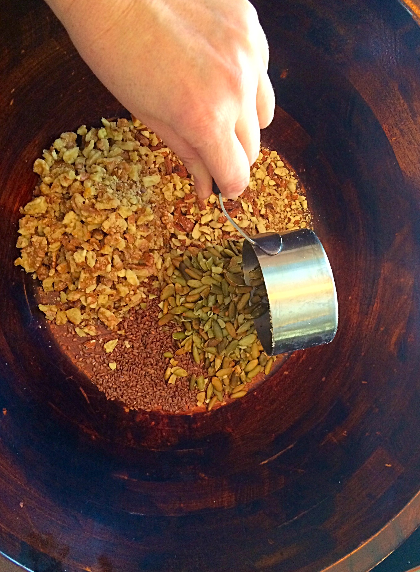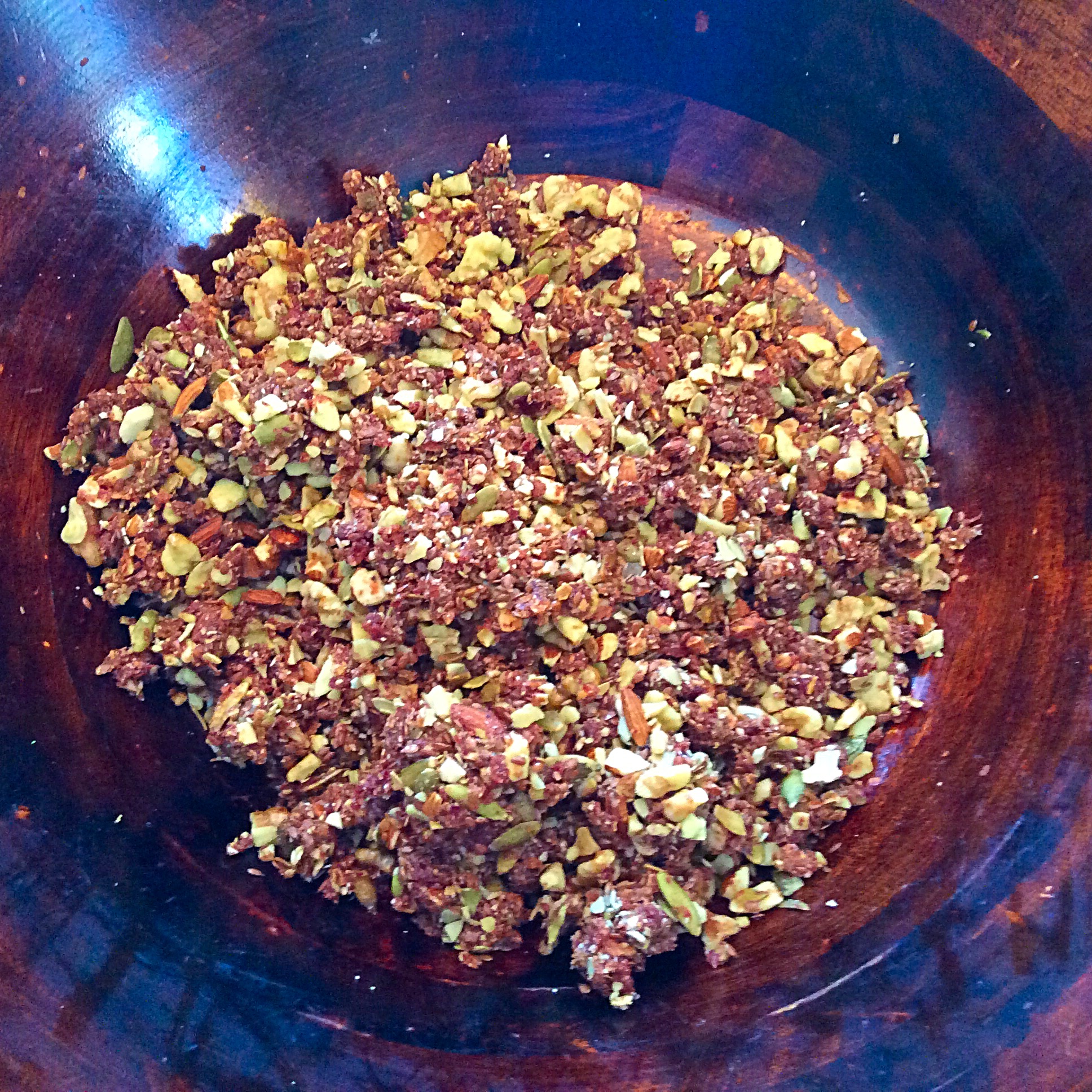 First, add nuts and seeds