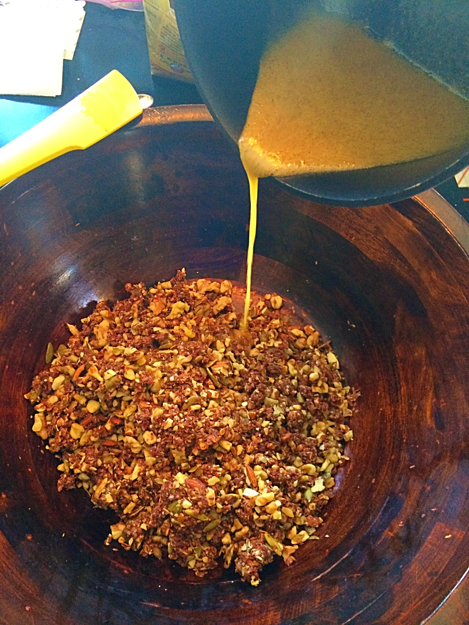 Cook up the magic sticky in a saucepan, mix the honey, vanilla and whatever seasonings you feel are necessary. Cook until it comes to a boil and then boil for 30 seconds or so. Nope, not an exact science. I feel like cinnamon is always a good idea. I’ve used ginger, nutmeg, clove and I have friends who swear by turmeric. I haven’t jumped on the turmeric bandwagon yet, because it almost has the word tumor in it and I am sometimes emotionally 13 years old.