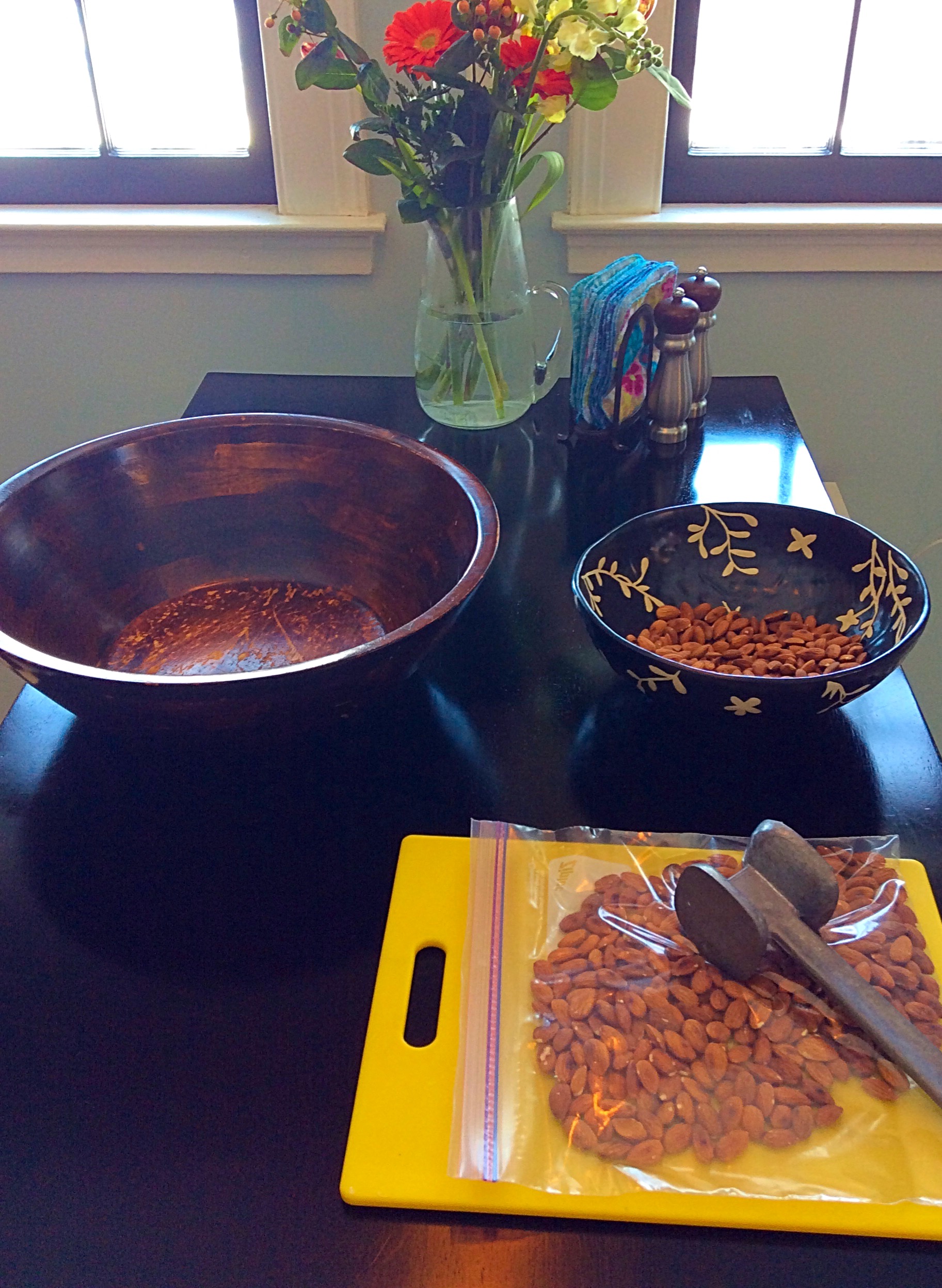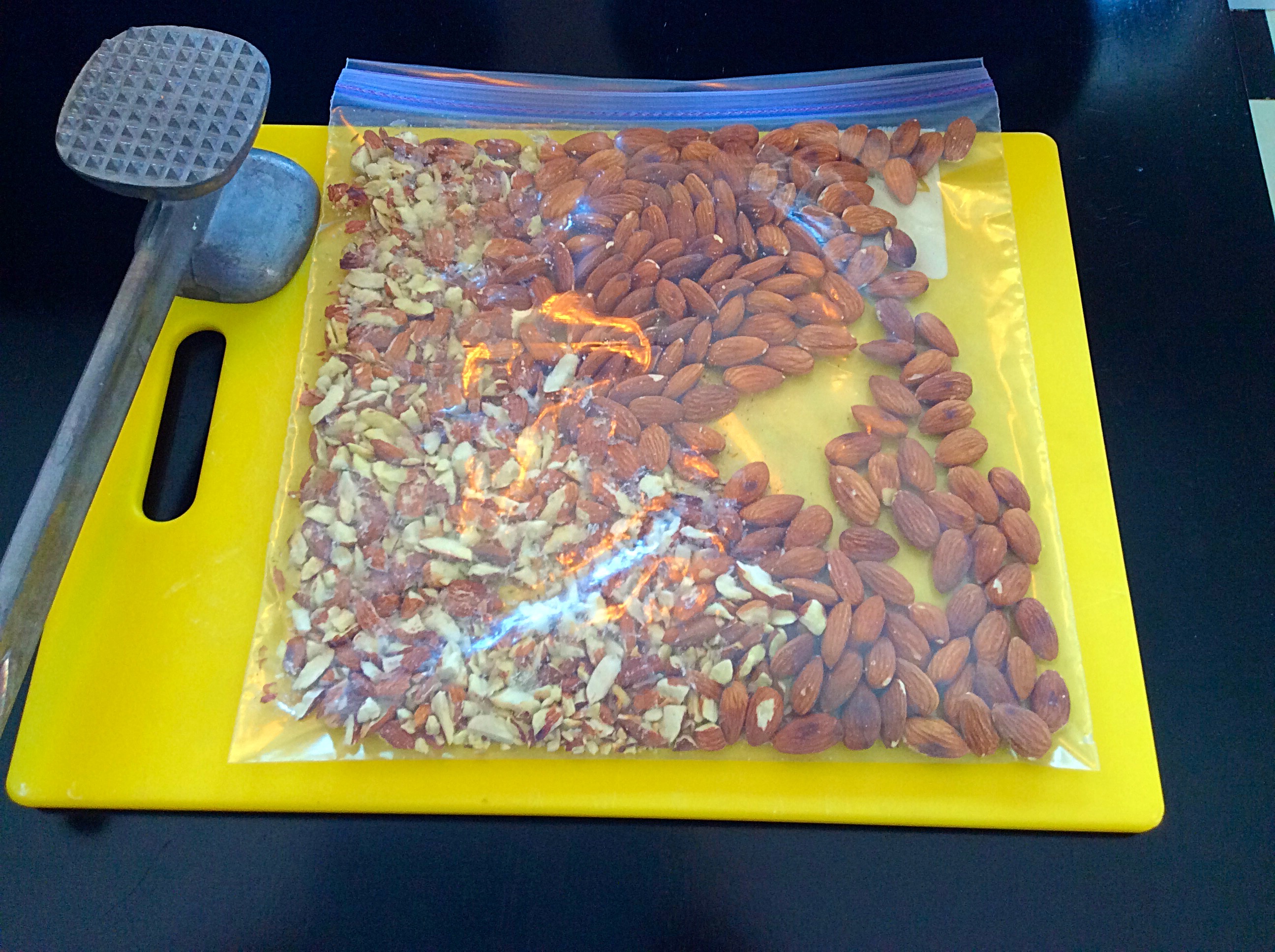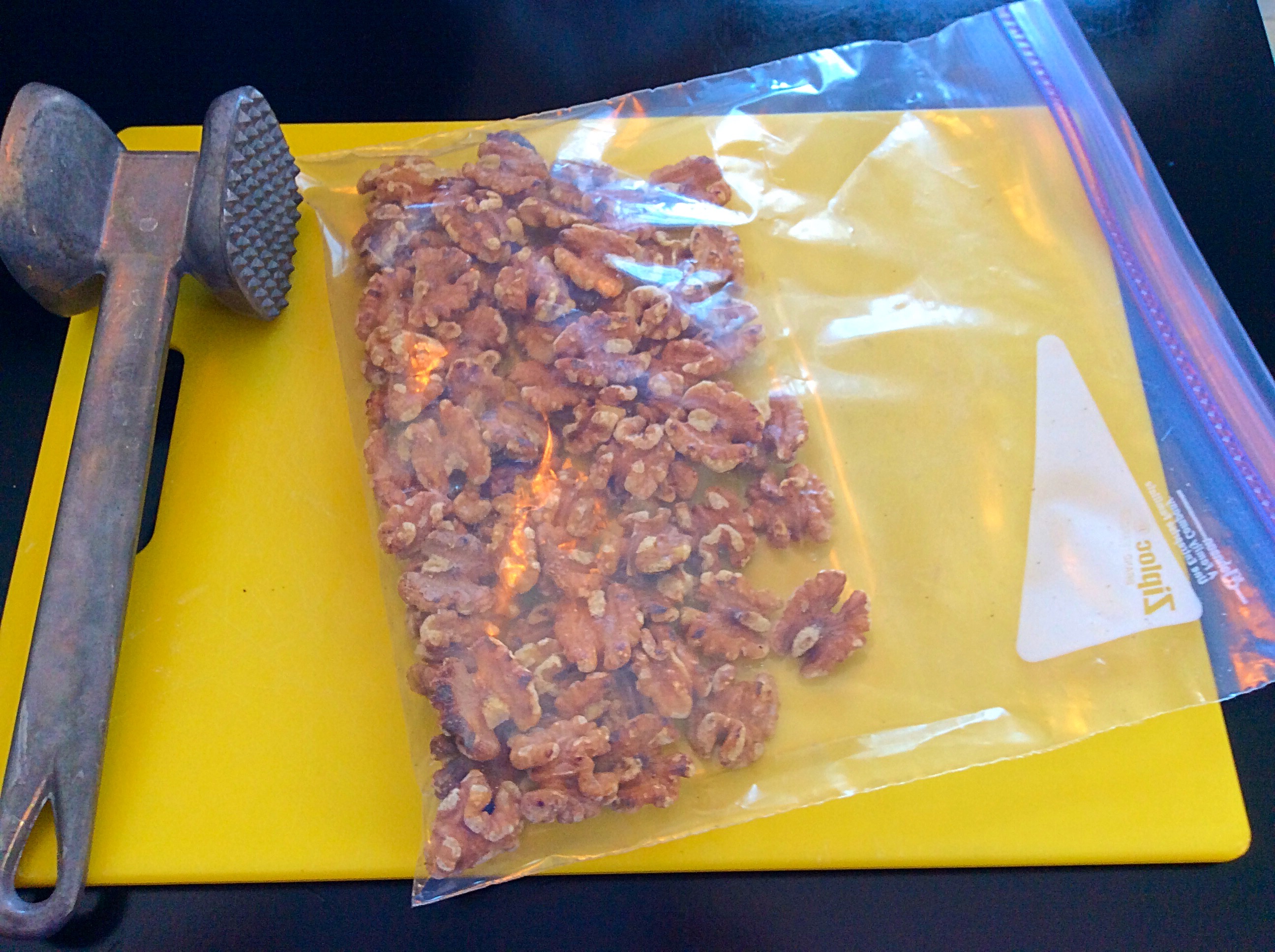 To chop the nuts into the appropriate size, I put them in ziplock bags and beat the crap out of them with my meat tenderizer. It’s very relaxing. If you have the means, I highly recommend it.