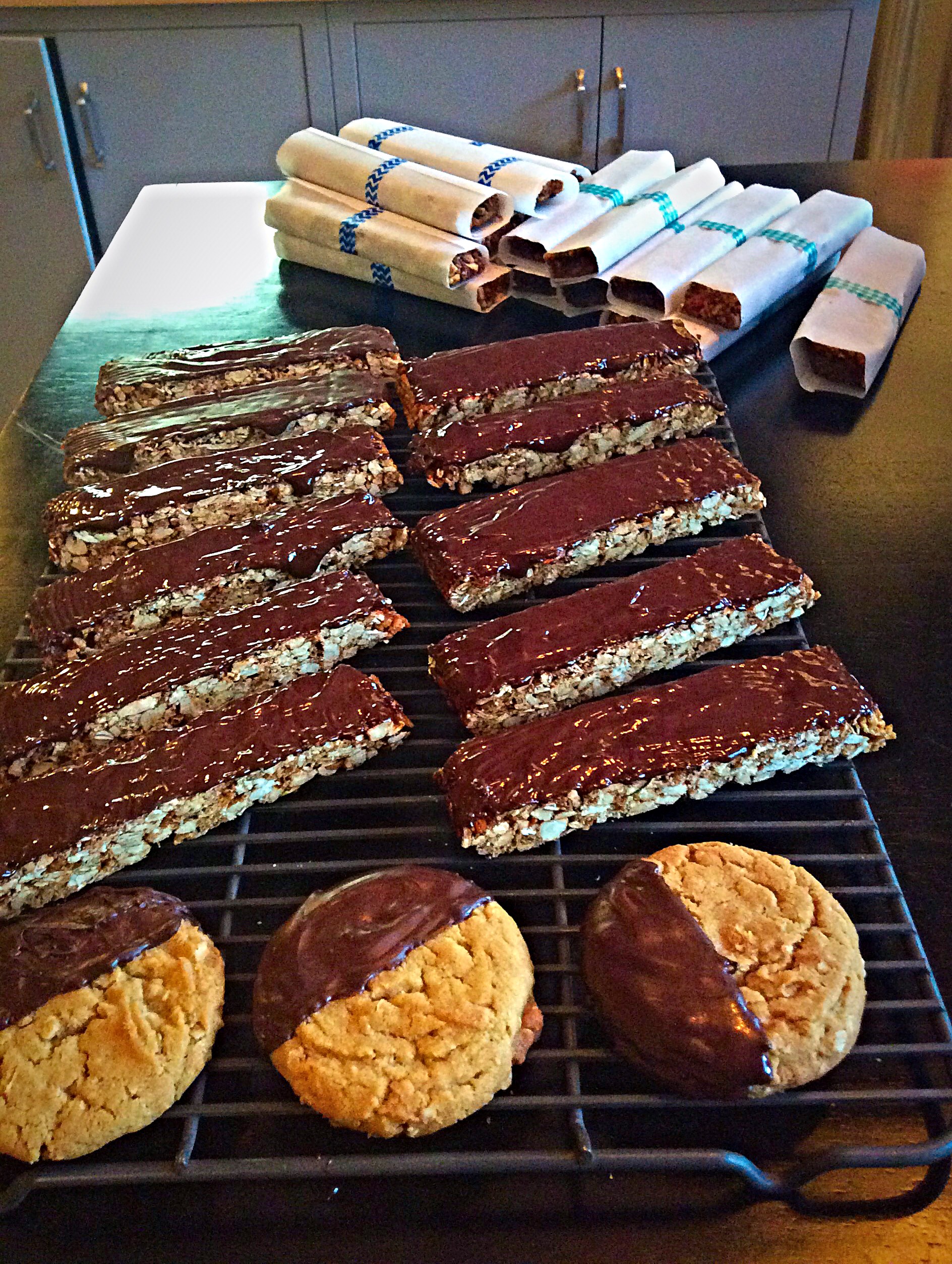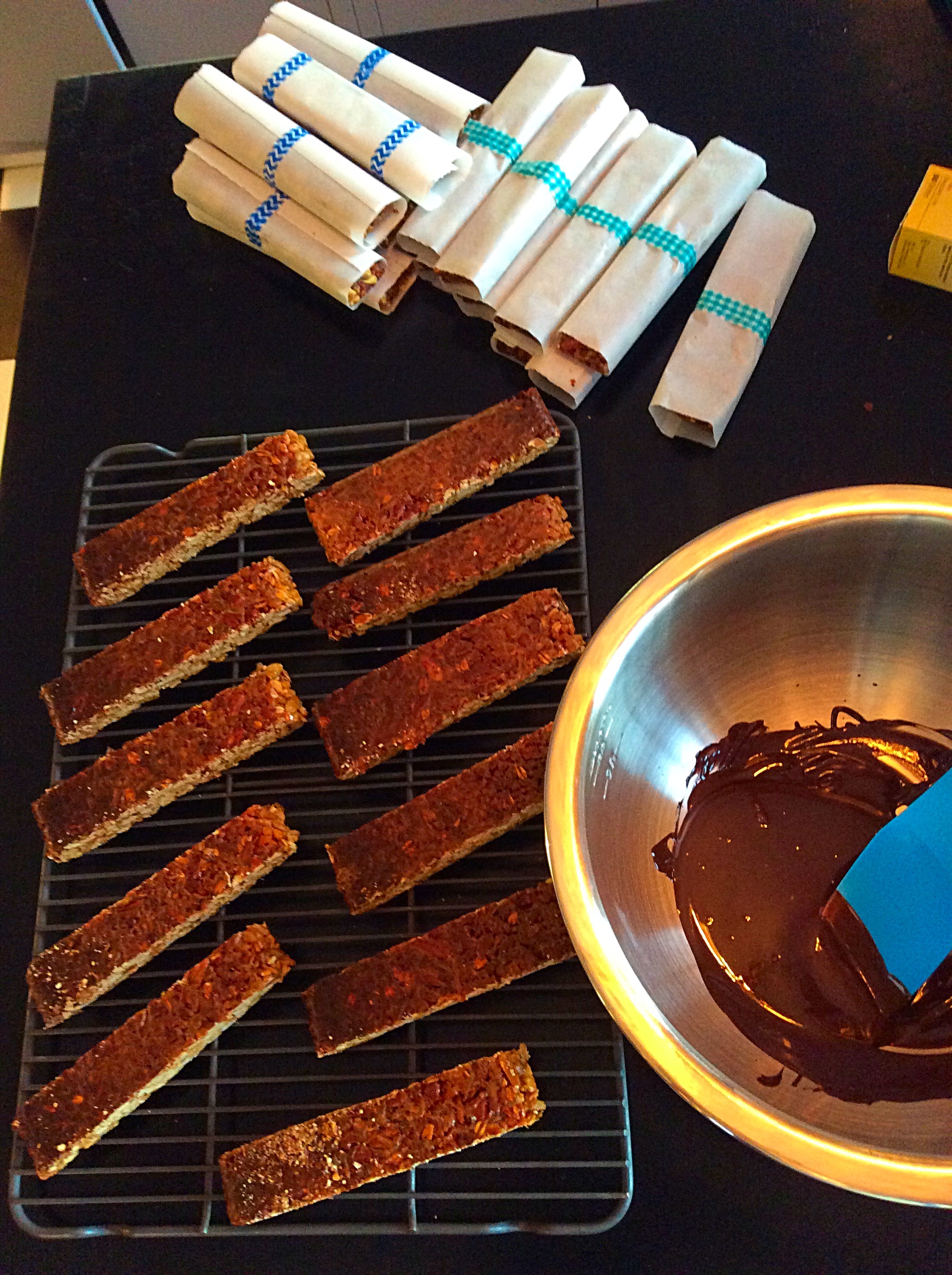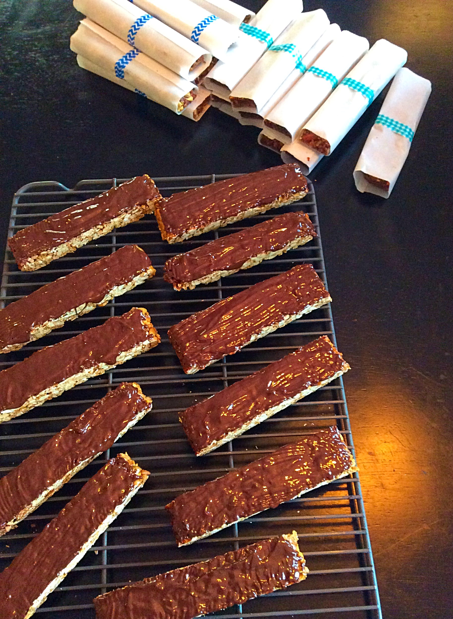 Chocolate Step (for The Giant’s Version and real chocolate lovers) In the top of a double boiler (who the hell are we kidding? The double boiler is really hard to wash. I use a bowl on a pot) melt chocolate and then using a rubber spatula, spread on the bottom of the bars. Allow to cool—I wrap the other bars while the chocolate sets.