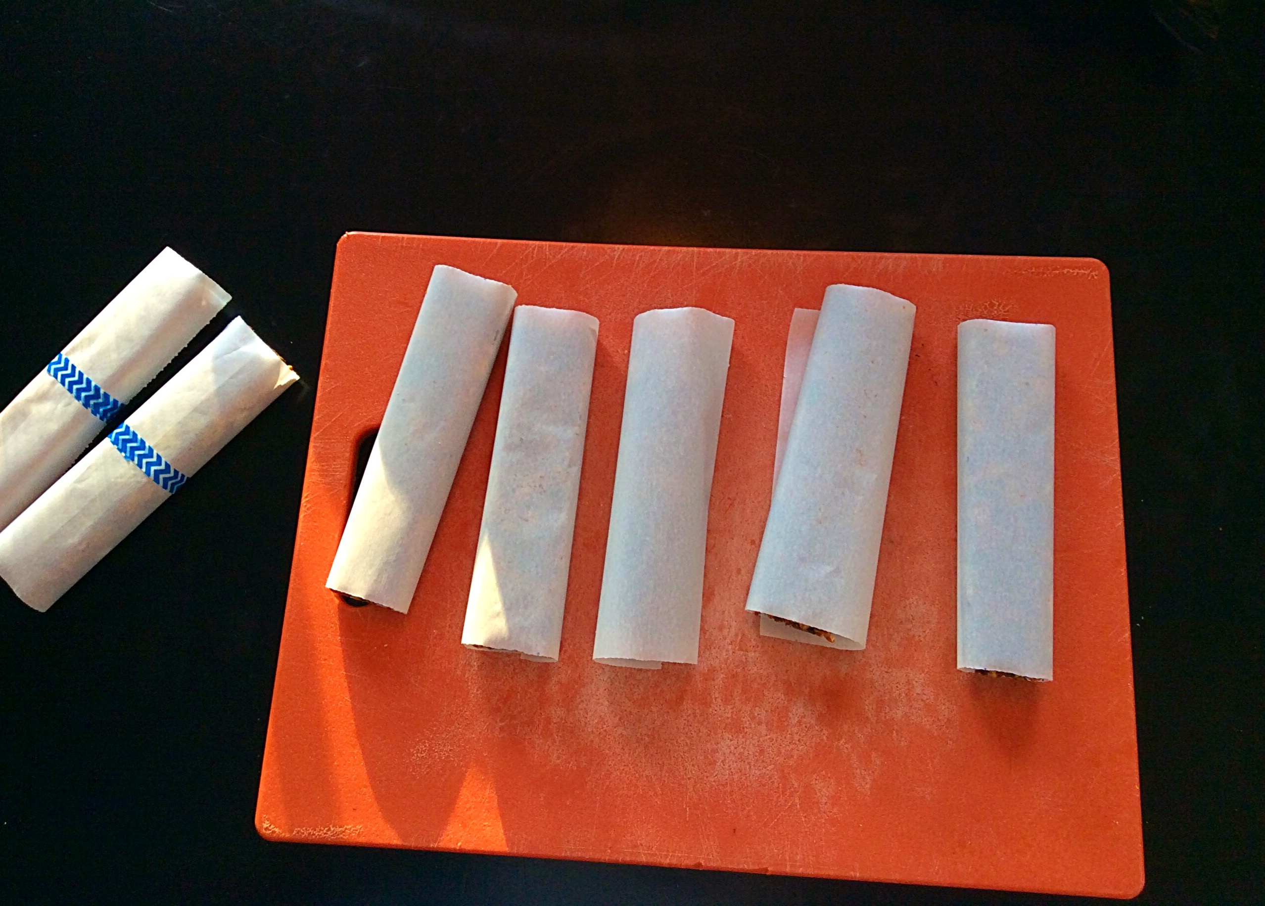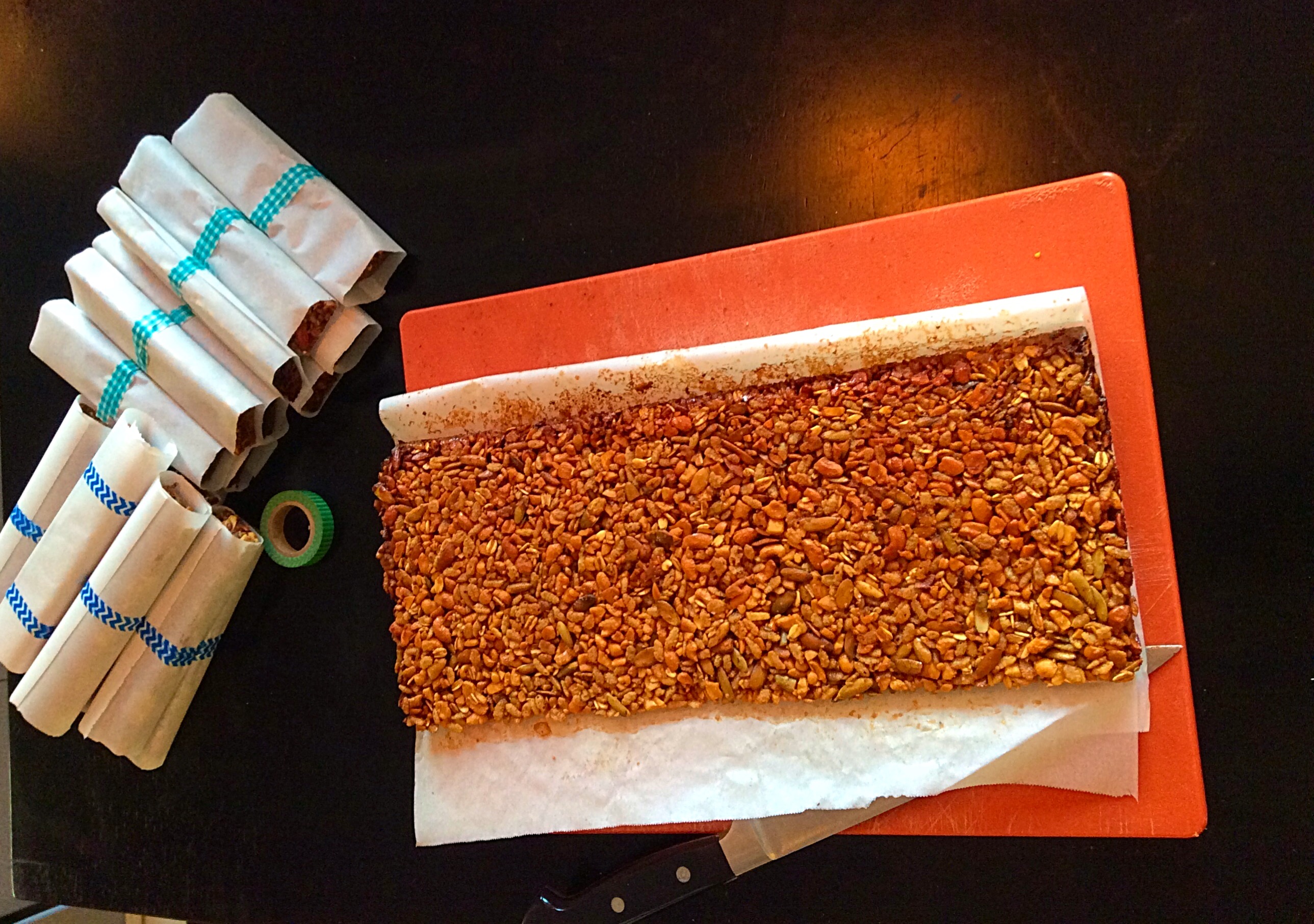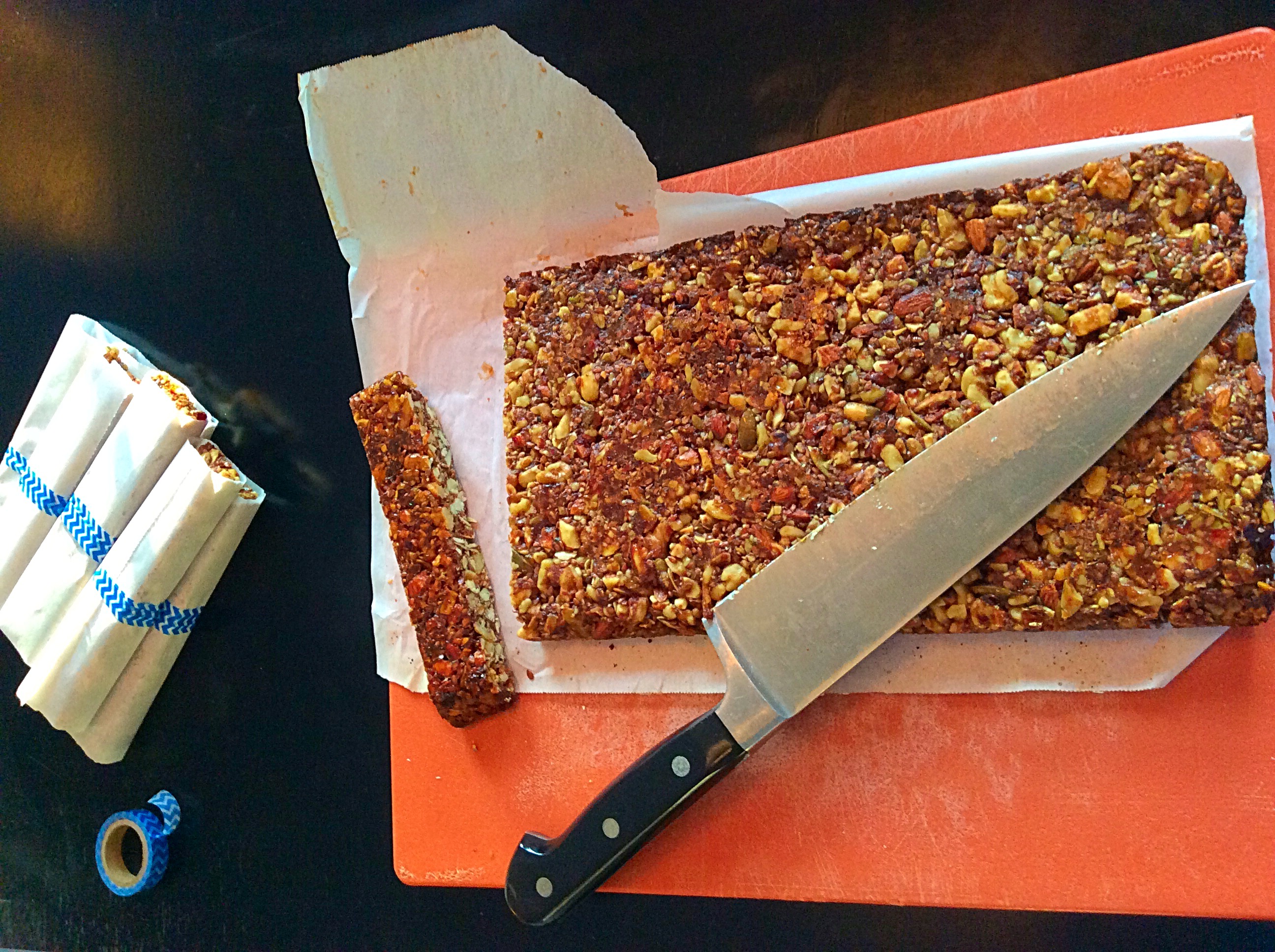 Cut and wrap. I wrap these in bits of parchment paper and then put them in little plastic bags labeled “Pretzel Bags” that I pick up at the craft store. Because I have a picky eater, I “label” the three different kinds of bars with pretty tape. I have also been known to mark them with a Sharpie–some days I’m cuter than others.